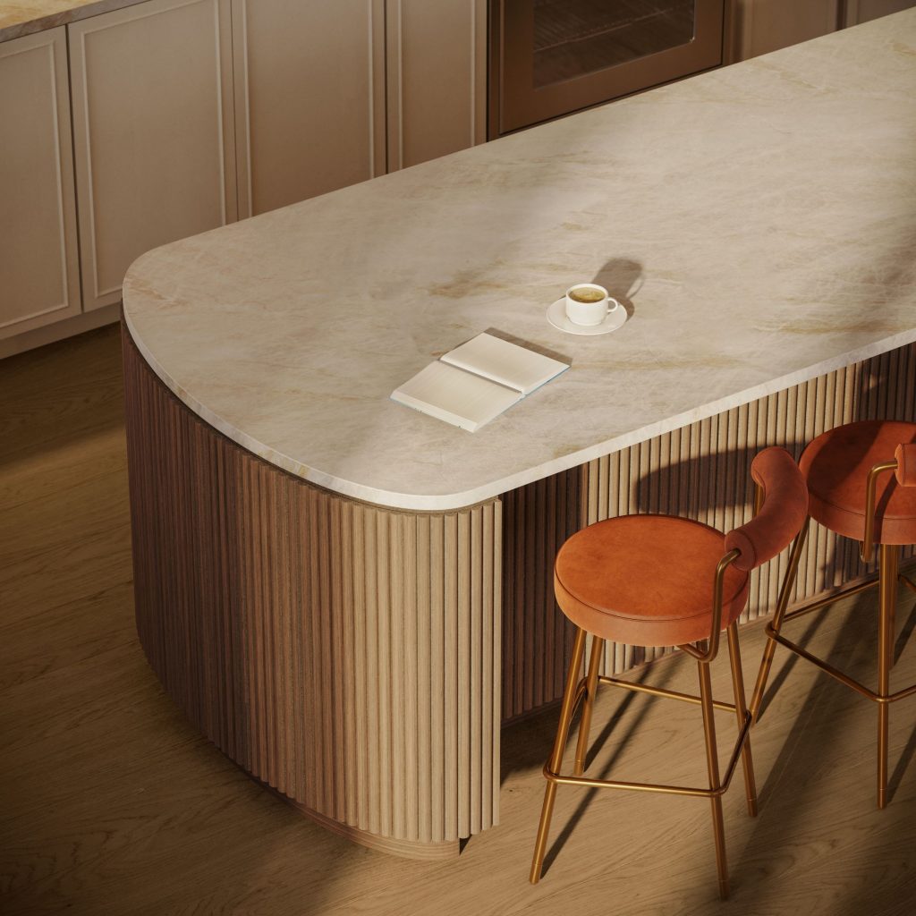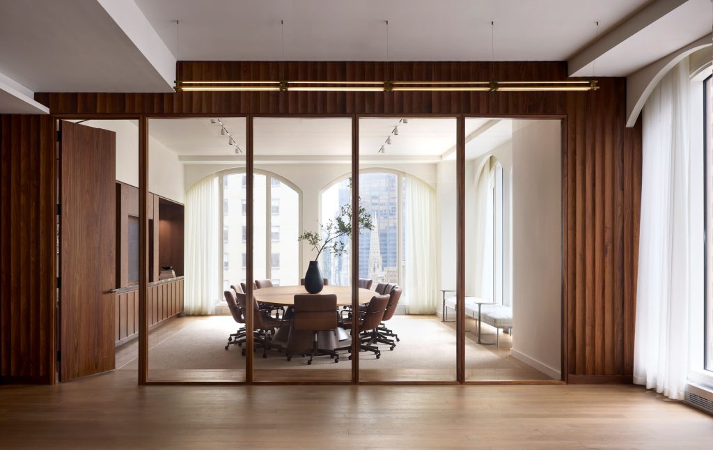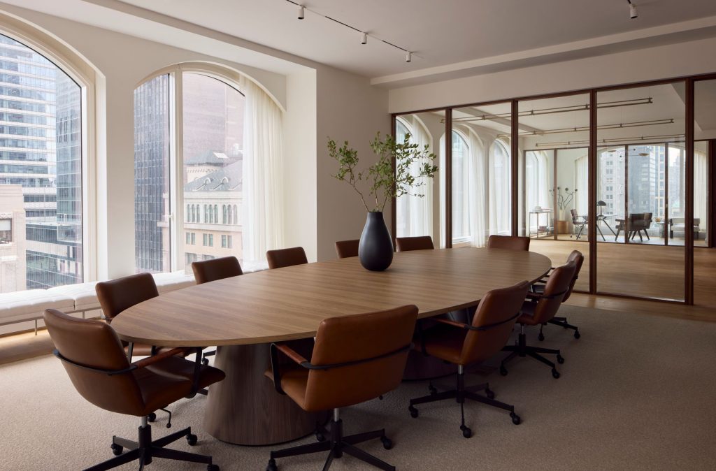 The tower balances heritage-inspired aesthetics with contemporary urban functionality. Office interiors employ a residential-quality material palette of natural stone, wood, and polished metals. Large operable arched windows provide daylight and city views.