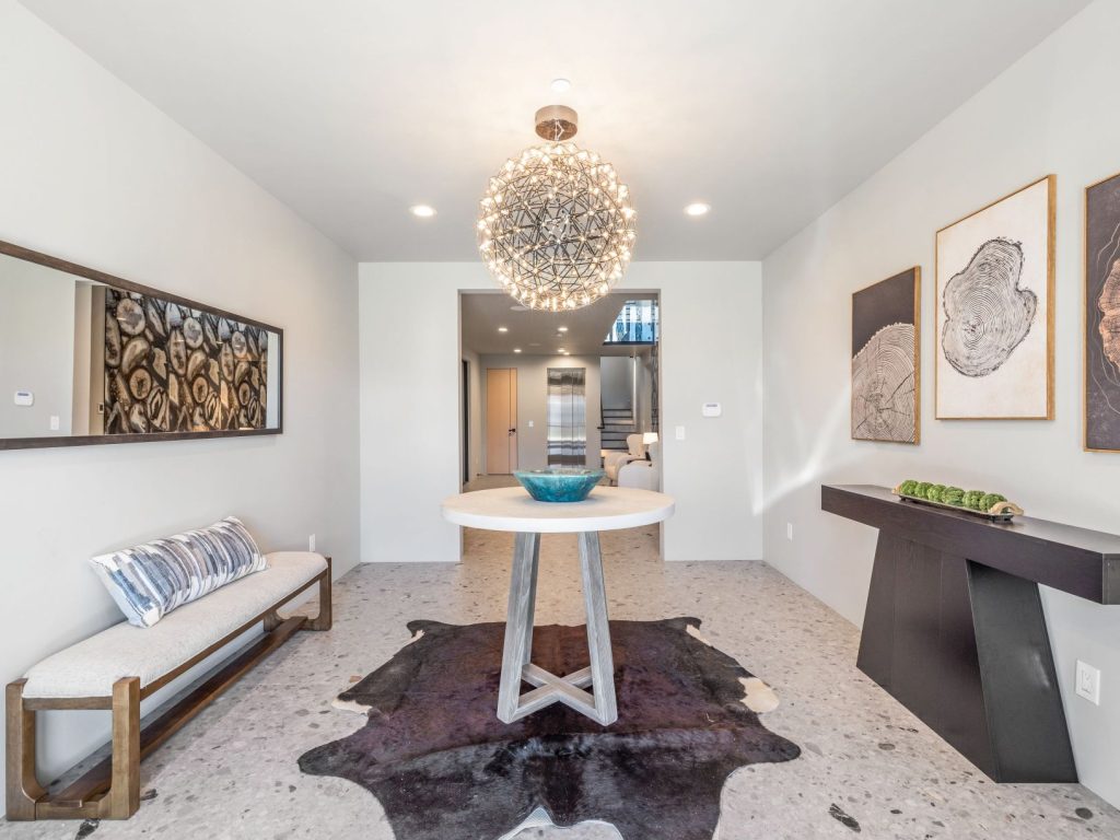 The home’s modern aesthetic combines concrete, steel, and glass. Insulated Concrete Forms (ICF) provide year-round thermal efficiency, fire resistance, and hurricane-level wind protection. Architectural highlights include a two-level wall of agate connecting the first and second levels and a 20ft fireplace in the main living room.